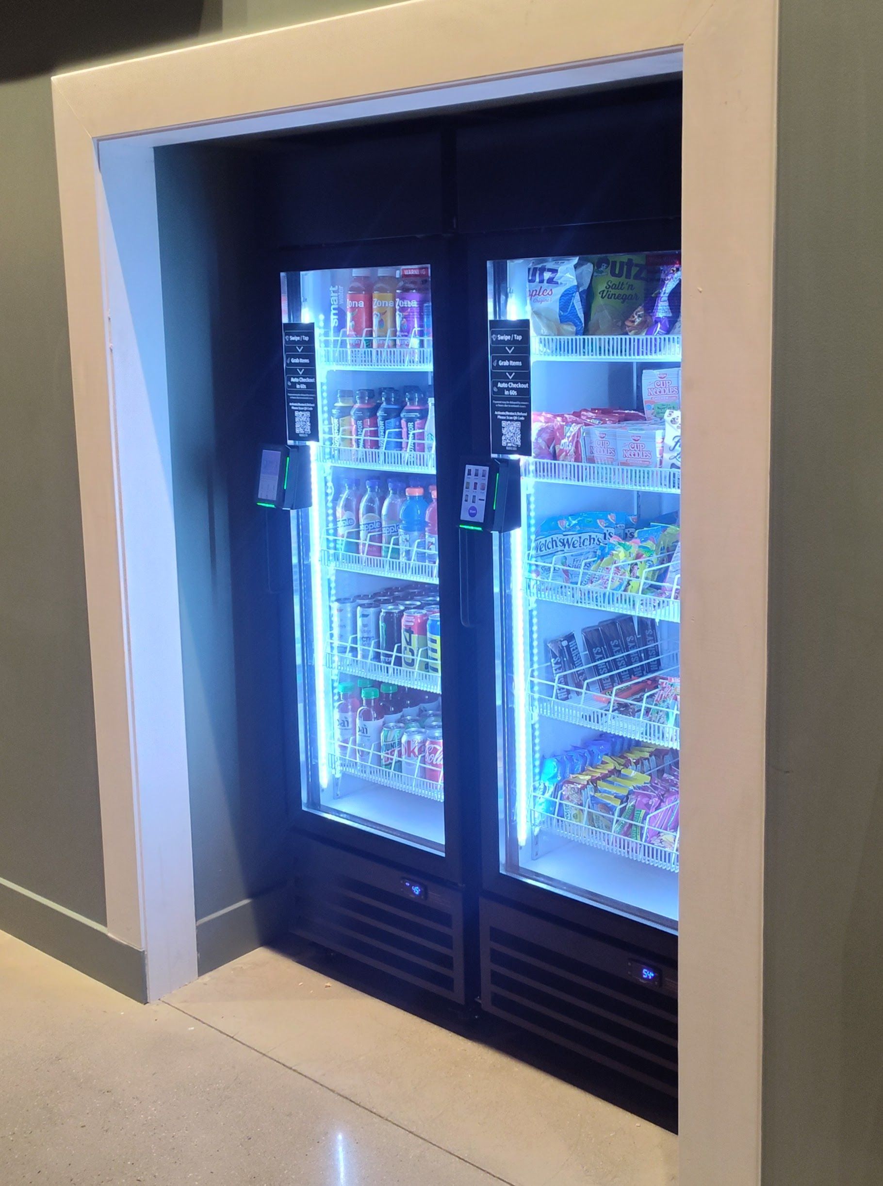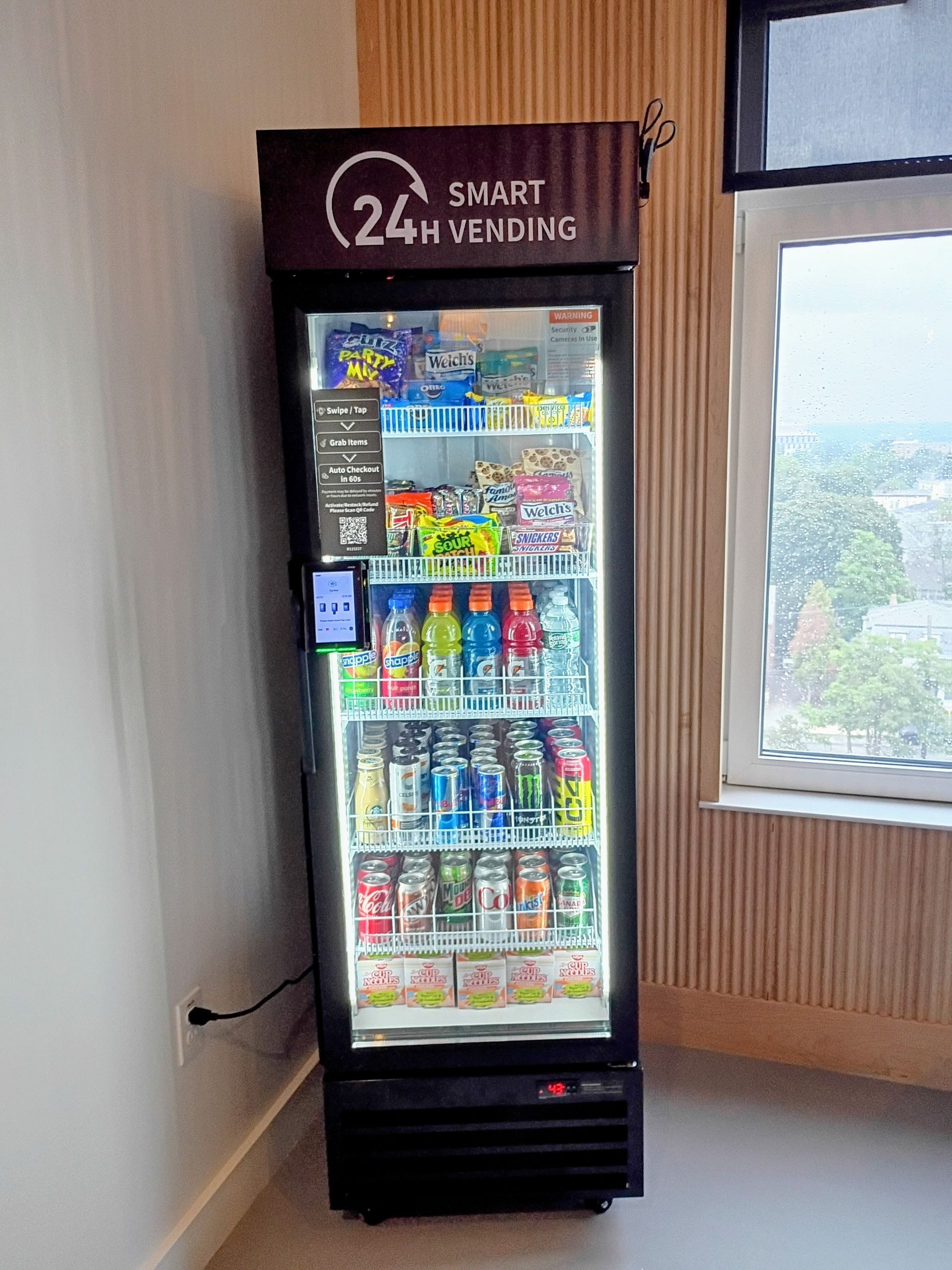 The AI vending machine shown in this picture is designed for a seamless user experience: Customers simply tap their card on the machine's door handle/card reader, select their desired snacks, and within a minute, their card is charged accordingly.